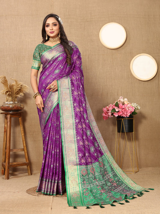 Soft Patola Green Purple Silk Saree With Meenakari Zari Weawing Motifs