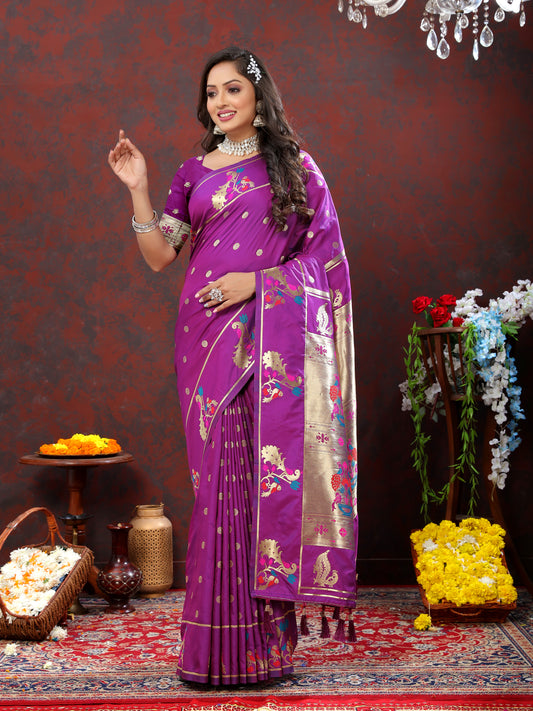 Soft Pethani Silk Royal Purple Saree with Golden Zari Weawing Motifs