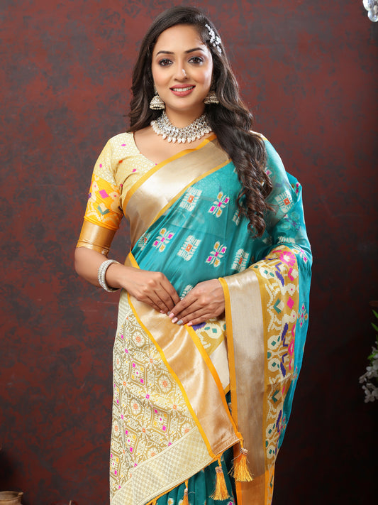 Soft Patola Green Maroon Blue Saree With Meenakari Zari Weawing Motifs
