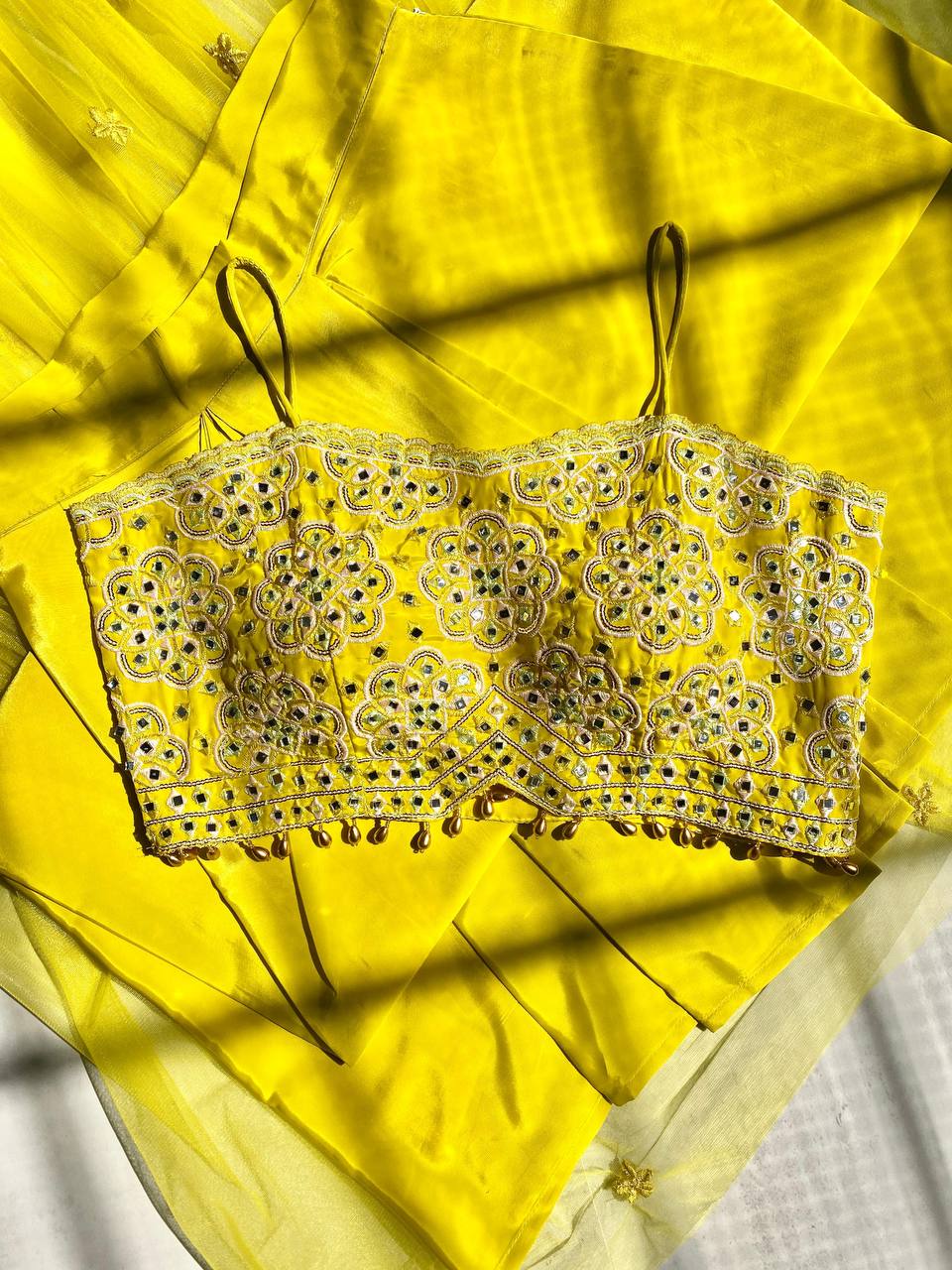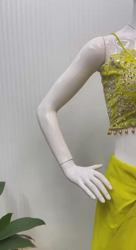 Expertly crafted with French Silk and delicate mirror embroidery, this lehenga choli set exudes elegance and grace. The tube blouse and draped dhoti, both made of French Silk, offer a comfortable and flattering fit. With a stunning net shrug adorned with intricate embroidery and mirror work, this set is perfect for special occasions. Don't sacrifice style for comfort – this set has it all.
